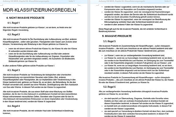 Welchen Einfluss hat die Zweckbestimmung nun auf die Risikoklassifizierung? Um das zu verstehen, muss man sich bewusst machen, dass die Risikoklassifizierung anhand von 22 Regeln durchgeführt wird. Diese Regeln sind jedoch nicht ungeordnet aufgeschrieben, sondern nach Produktkategorien gegliedert (vgl.: Anhang VIII MDR, s. auch die hier angehängte Arbeitshilfe 01062_a.docx).