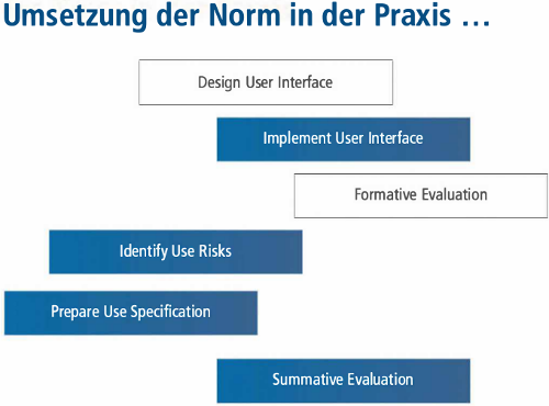 An diesen Beispielen erkennt man, dass die IEC 62366-1 in der Praxis mit dem, was sie vorschreibt, nicht zwangsläufig zu einem richtigen guten Produkt führt. Wenn man sich die Phasen aus der Norm genauer anschaut, lassen sich drei Phasen gruppieren: